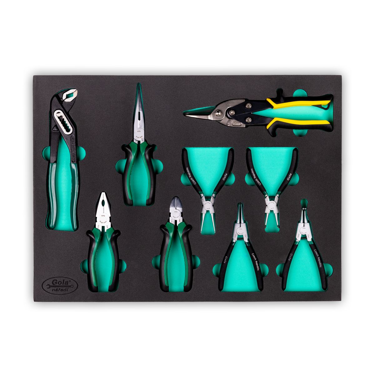 Profesionální sada kleští GOLA přehledně uspořádaná pro snadné použití v dílně i servisu. Obsahuje široký výběr kvalitních kleští pro různé typy práce - od jemné mechaniky až po práci s plechem a pojistnými kroužky.